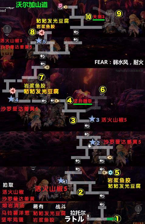 1种弱水,1种弱水风,1种弱水打,都耐火。掉落5种料理素材