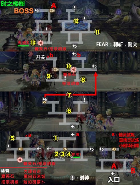 ①~⑬,其中④是梦书,⑬是天剑×3。梦书房间的门要同时踩点才能开,失败5次尤利会帮忙开门。
