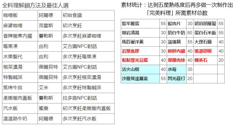 ③新食谱可通过不断制作料理,以及和火之村/水之都的NPC对话获得,见下图,来自巴哈