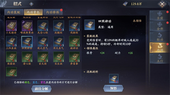 《清心诀》增加血量较低时的伤害,《三阳真决》提升对定身/封招/眩晕敌人的伤害,最后是《四照神功》,受到伤害时,有10%的几率对敌人造成20%的减速。