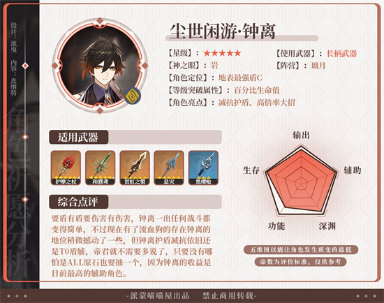 钟离就不需要太多陈述了,T0级别的护盾,T1级别的伤害,有控制满命还有回血,只要你没有钟离就一定要去抽一个,哪怕是不用也要留在仓库备着,总有一天你某些任务关卡过不去的时候,钟离的护盾可以解决你80%的烦恼,总之一句话没有钟离就抽!