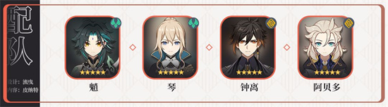 胡行钟阵容说过太多次就不去多说了,这里就说下在上个UP池子中的魈吧,在有魈有钟离的情况下可以去玩一个双风双岩组合,魈开启大招会持续掉血并且切换角色会立即终止大招所以钟离的护盾至关重要,琴则是为魈回血加充能,虽不如胡行钟但这套阵容下魈的生存率大大提高。