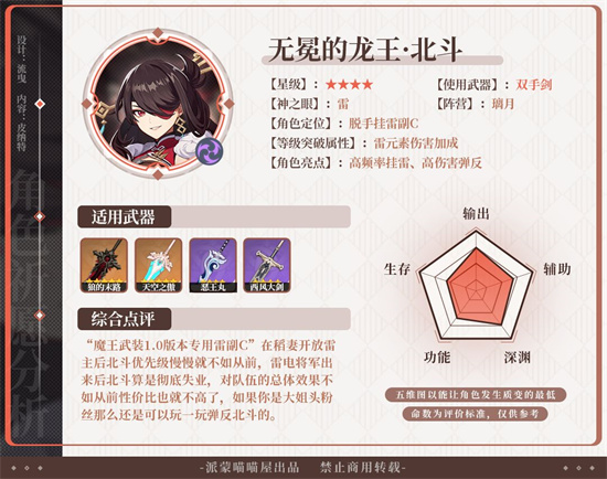 大姐头和皇女的双雷搭配是在早起魔王武装中最常见的阵容,但随着雷神等角色实装后,雷队有了新的搭配思路,所以北斗的出场率也就有所降低。主要还是因为北斗的大招需要80点能量,而且覆盖率较低,雷电将军的E技能就有着很高的覆盖率这么一比的话北斗的性价比就微乎其微,但如果你没有雷电将军的话也可以抽1-2命北斗暂时过渡等雷神复刻即可不需要强行抽满。