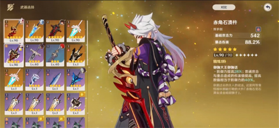 一斗赤角石溃杵+华馆套,五郎祭礼弓+攀岩套,钟离决斗枪+宗室千岩,班尼特天空之刃+宗室。