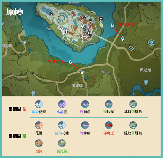 2、【果酒湖南面】的鱼类有:花鱂、蓝染花鱂、鸠棘鱼、赤魔王、流纹茶蝶鱼、炮鲀、苦炮鲀。(果酒湖钓鱼位置见下图↓)