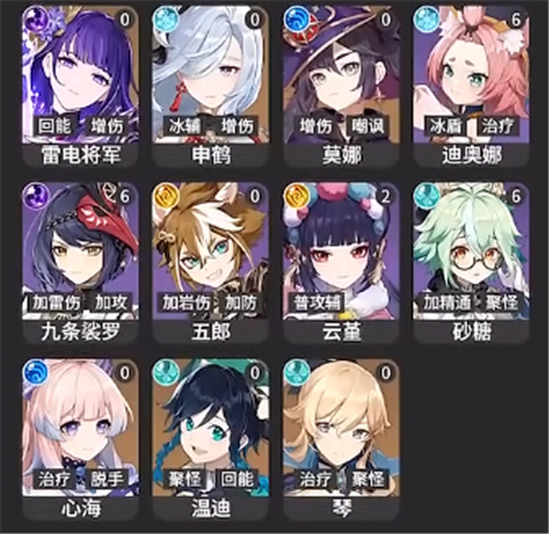 2、【T1】:雷电将军、申鹤、莫娜、迪奥娜、九条裟罗、五郎、云堇、砂糖、心海、温迪、琴