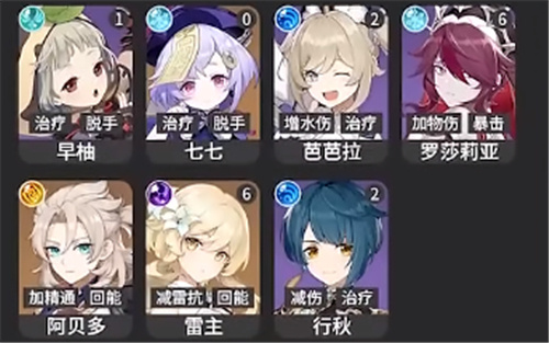 3、【T2】:早柚、七七、芭芭拉、罗莎莉亚、阿贝多、雷主、行秋