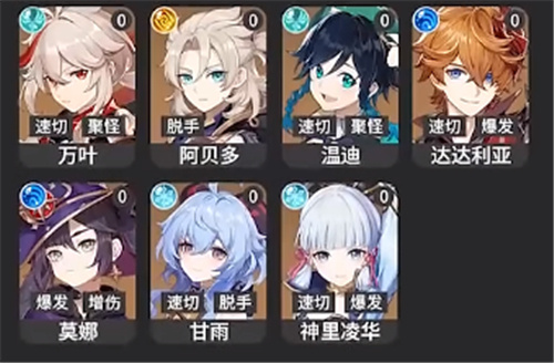 2、【T1】:枫原万叶、阿贝多、温迪、达达利亚、莫娜、甘雨、神里绫华