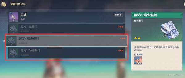 1、去蒙德钓鱼协会获取【蠕虫假饵】和【飞蝇假饵】配方