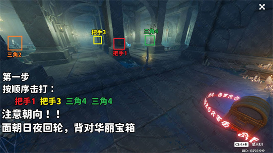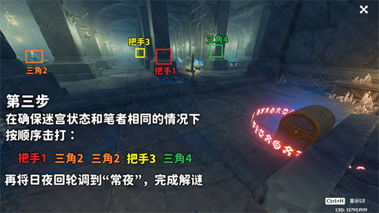 (4)在(3)的基础上,按顺序击打:把手1,三角2,三角2,把手3,三角4。再将日夜回轮转换至“常夜”,即可完成解谜,打开华丽的宝箱,获得另一个「伊达的认可状」。