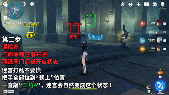 (3)检查墙壁和闸门的状态,此时应当三面墙都在最右侧,且两道闸门都是开启状态。如果你已经动过迷宫,你可以将“把手1”,“把手3”拉到“朝上”的位置,之后不断击打“三角4”,迷宫也会变成这个状态。