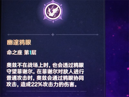 奥兹不在战场上时,也会透过鸡眼守望菲谢尔。在菲谢尔对敌人进行普通攻击时,奥兹会通过鸡眼协同攻击,造成22%攻击力伤害。