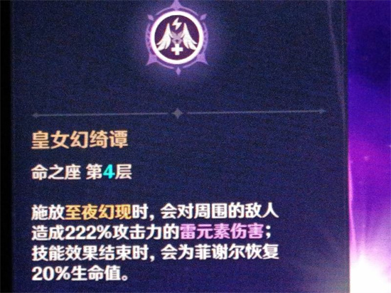施放至夜幻现时,会对周围的敌人造成222%攻击力的雷元素伤害;技能效果结束时,会为菲谢尔恢复20%生命值。