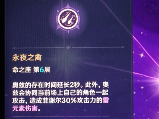奥兹的存在时间延长2秒。此外,奥兹会协同当前场上自己的角色一起攻击,造成菲谢尔30%攻击力的雷元素伤害。