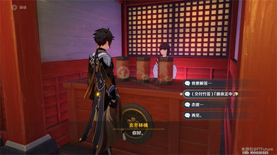 抽签之后与玄冬林檎对话交付竹签,选择带有暗号“胧夜正中”的选项。