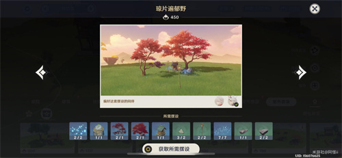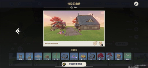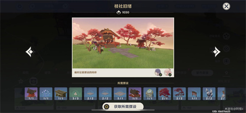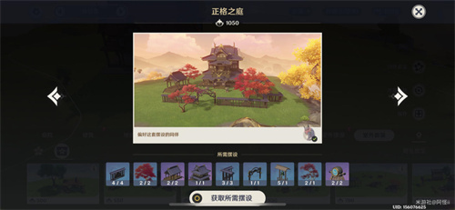 套装:军势钲鼓-「破阵余响」*2、阵屋半钟-「轰雷之音」*1、栏楯转角-「瞩视无遗」*3、要地栏楯-「约己之壁」*4、要地牙门-「云底之能」*1、官邸回廊-「势至权达」*2、稻妻官邸-「严谕正办」*1、「片叶苏芳缀银朱」*2、「红鸢问寝觉」*1