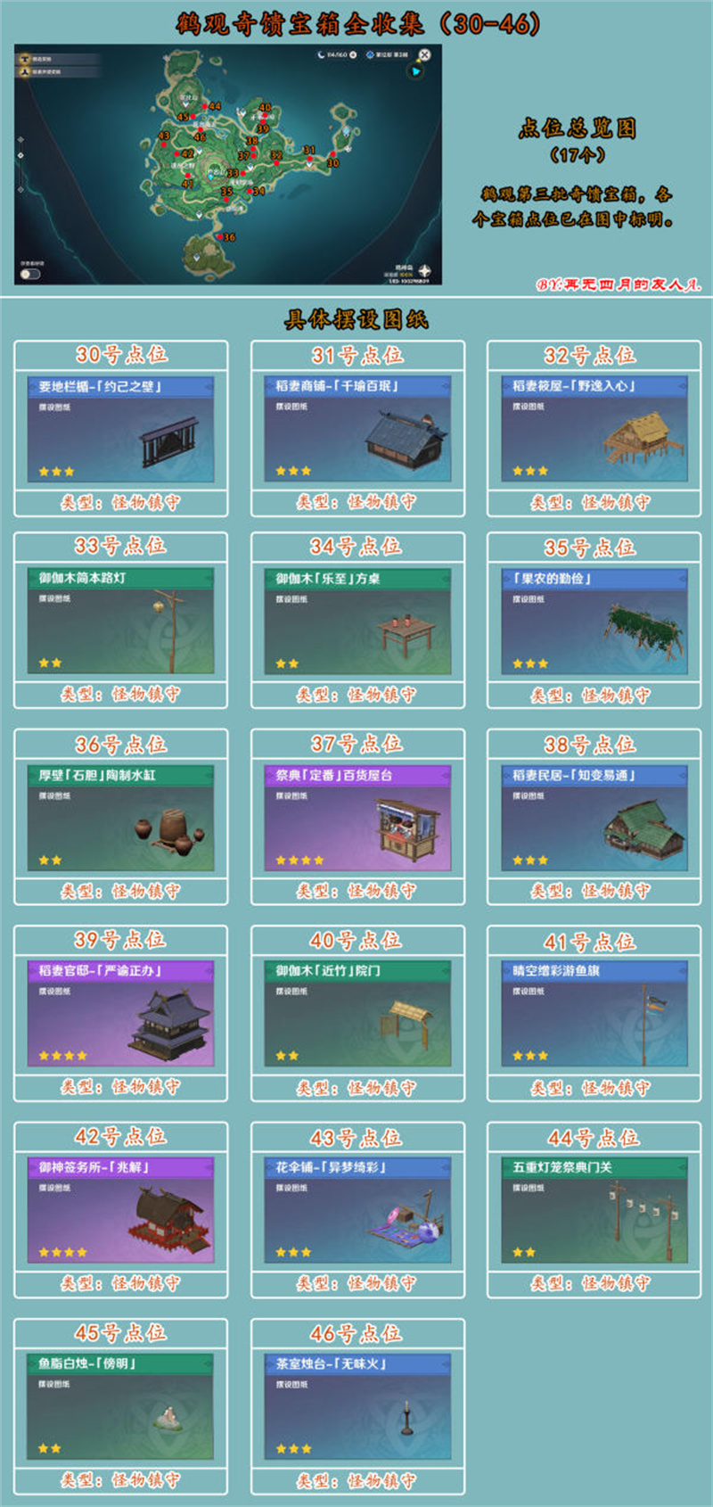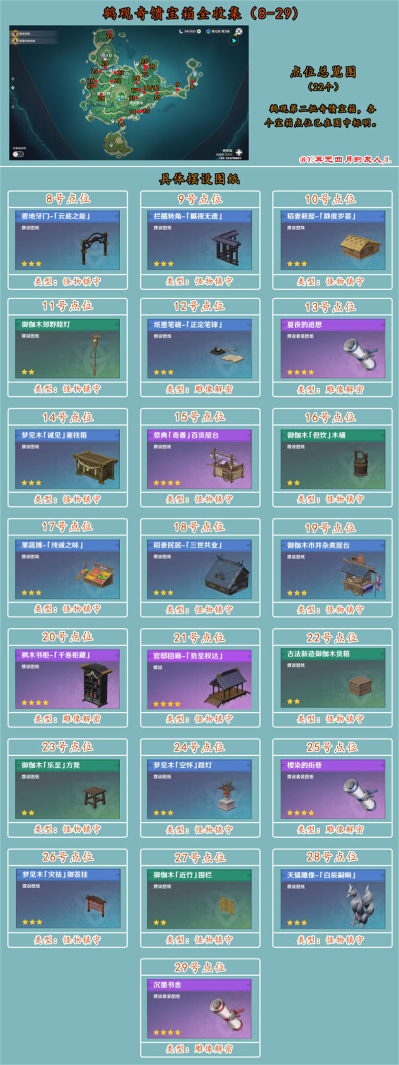 3、为保证游戏趣味性,本攻略只标明奇馈宝箱点位图以及对应摆设图纸,不涉及解密方法
