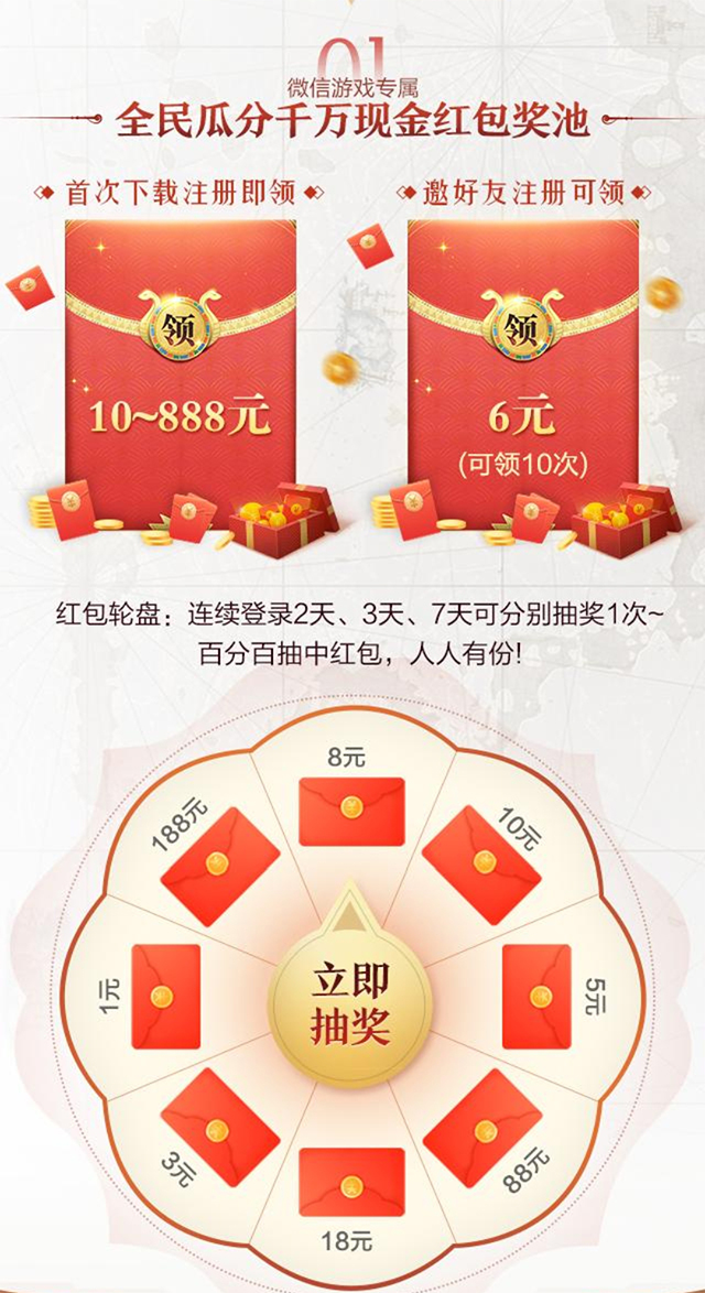 ③【红包轮盘】连续登录2天、3天、7天可分别抽奖1次,百分百抽中红包,人人有份;