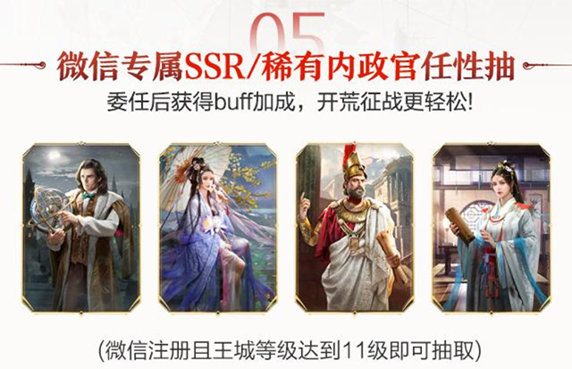 微信注册且王城等级达到11级即可抽取。委任后获得buff加成,开荒征战更轻松!