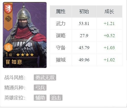 在重返帝国手游中,崔如意是属于游戏中的紫卡英雄。针对此小编下面分享重返帝国崔如意怎么玩,属性介绍:
