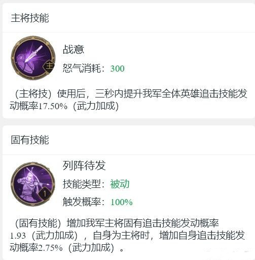 2、【列阵待发】:增加我军主将固有追击技能发动概率1.93(武力加成),自身为主将时,增加自身最忌技能发动概率2.75%(武力加成)。