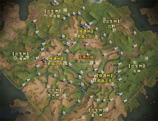 帝国大陆共分六大出生州、三大资源州、核心君临州。在进入游戏后,我们会出现在六大出生州之一的某个位置,由此开启征途。
