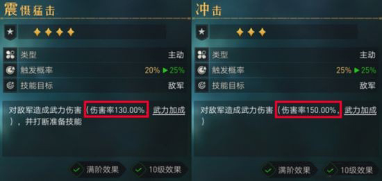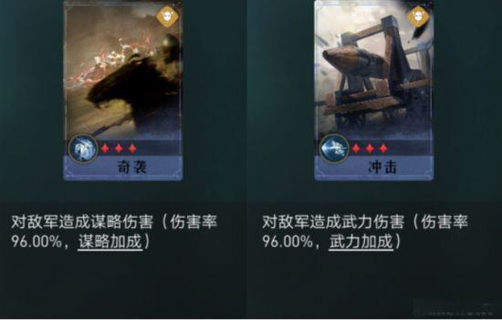 【冲击】和【奇袭】一武一谋两种伤害型主动技能,适用所有对应主属性的武将。