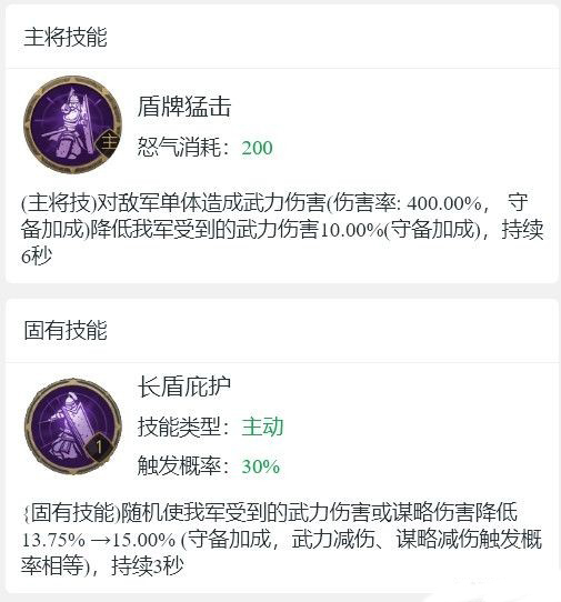 2、【长盾庇护】:随机使我军受到的武力伤害或谋略伤害降低13.75%=>15.00%(守备加成,武力减伤、谋略减伤触发概率相等),持续3秒。