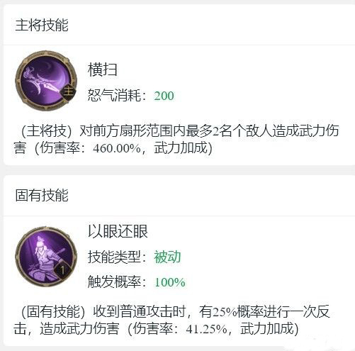 2、【以眼还眼】:收到的普通攻击时,有25%概率进行依稀反击,造成武力伤害(伤害率:460%,武力加成)