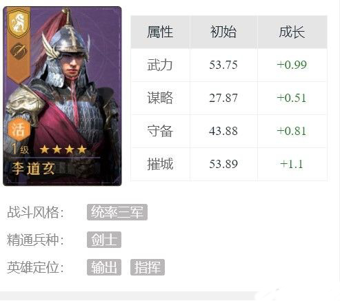 在重返帝国手游中,李道玄是属于游戏中的紫卡英雄。针对此小编下面分享重返帝国李道玄怎么玩,属性介绍: