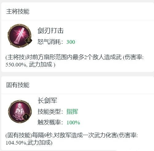 1、【剑刃打击】:对前方扇形范围内最多2个敌人造成武力伤害(伤害率:550%,武力加成)