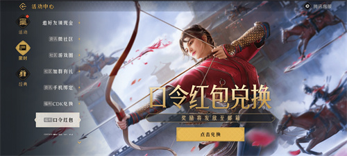 游戏主界面,点击右上角的“活动-限时-口令红包”,点击“前往兑换”,选择输入口令,再点击“兑换”即可。