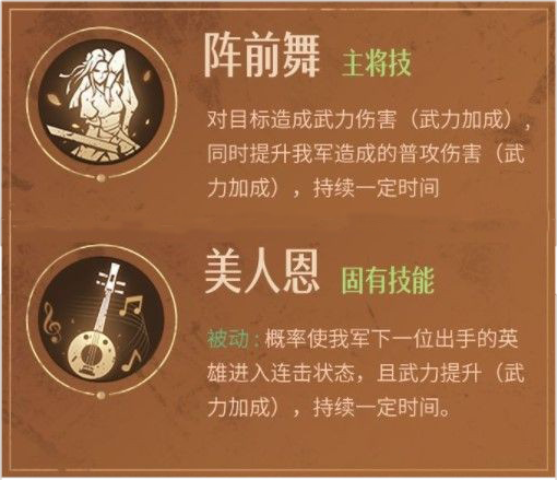 被动:概率使我军下一位出手的英雄进入连击状态, 且武力提升(武力加成),持续一定时间。