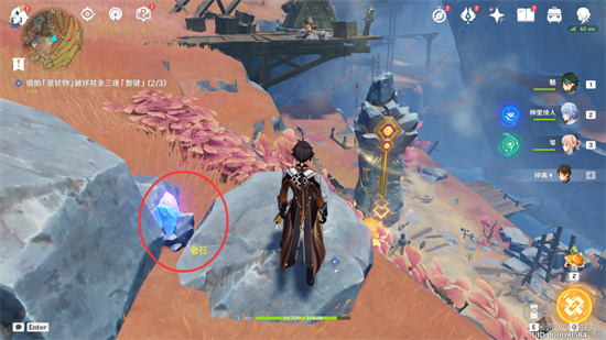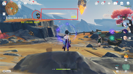 ※角色击碎并携带上「岩种子」,靠近下图的「笼状『岩元素』聚合物」,「岩种子」会挂机吸附进去。瞄准「磐键」方向,用单手剑/双手剑/长柄武器角色,普通攻击「笼状『岩元素』聚合物」,就可以破坏「磐键」了。