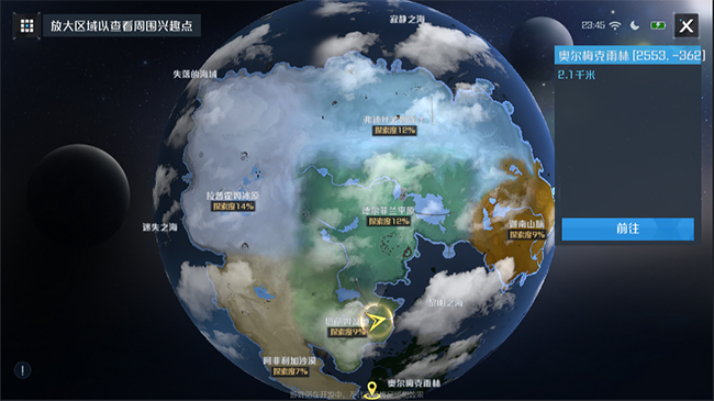 2、解锁过后可以看到很多地方都亮起来了其中有盆地、平原、冰原、冻土、沙漠、山脉。