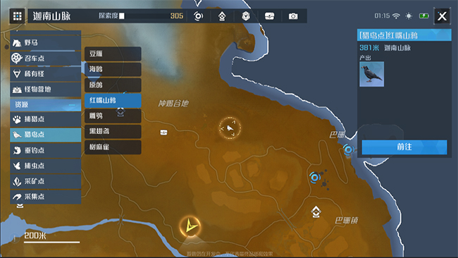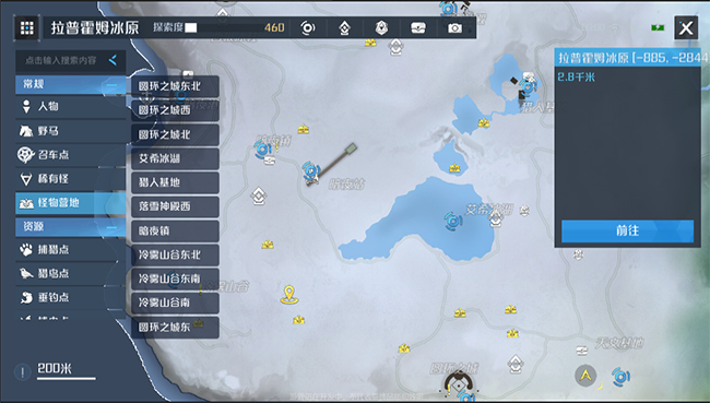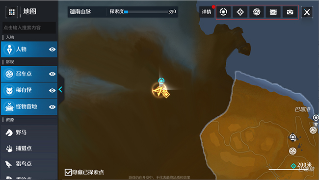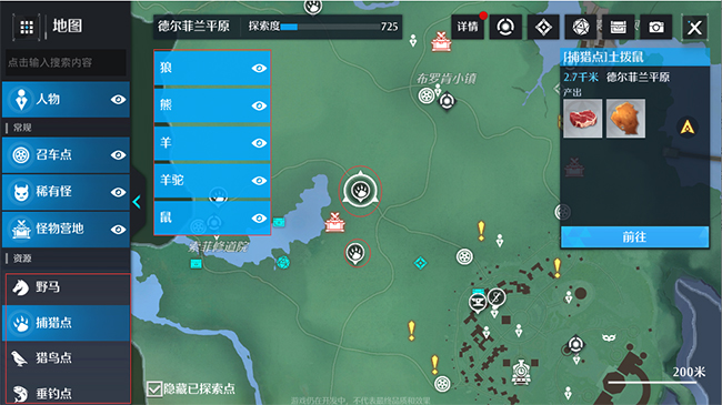 如果你所有地图传送点都解锁后,地图上可以找到对应地图的捕猎点、猎鸟点、垂钓点等基础的资源点。每个地图上的资源不一样,通过滑动地图即可找到不同的资源。