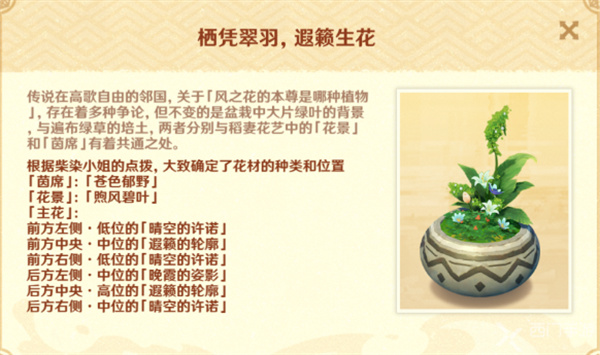 传说在高歌自由的邻国,关于「风之花的本尊是哪种植物」,存在着多种争论,但不变的是盆栽中大片绿叶的背景,与遍布绿草的培土,两者分别与稻妻花艺中的「花景」和「茵席]有着共通之处。