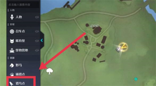 1、玩家在地图中可以点击左侧的资源列表,可以发现一个猎鸟点,然后找到附近鸟窝的位置,点击拿取即可。
