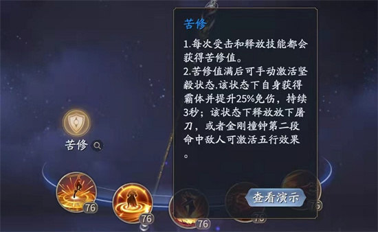 4、棍的被动为“苦修”。触发“苦修”的前置条件为:自身受击和释放技能获得苦修值,苦修值足够才可开启。