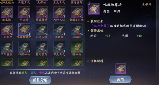 《月下断魂》、《神照经》、《纯阳无极功》、《唯我独尊功》这些都是双刃的专属内功,红色、橙色品级的内功比较稀有,所以这里推荐带《唯我独尊功》,它可以为双刀的伤害增加5%,非常稳定。剩下的,带上《拈花指》提升命中率,《长生诀》增加对定身敌人的伤害,《玄天指》增加续航能力,《清心诀》提升防御力。内功可视伤害需要,根据实际情况更换。比如说追求“龙瘴”的持续性输出时,可以将《长生诀》换成《四照神功》持续减速敌人,《拈花指》换成《炼筋诀》,打出破防输出。