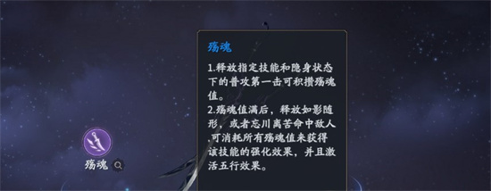 平时可以使用【邪魅惊愁】攻击目标增加殇魂值,用【如影随行】消耗殇魂值,当殇魂值达到3点时【如影随形】伤害达到最大化并产生硬直效果(霸体目标除外),