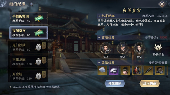 当我们的游戏等级到达60级,即可解锁相应关卡,推荐修为是45000,但是普通玩家无需等到对应的修为,只要达到60级,组上三五好友即可刷取。难度相较40级副本《牛栏街突围》高出了不少,对于玩家有着一定的操作要求。