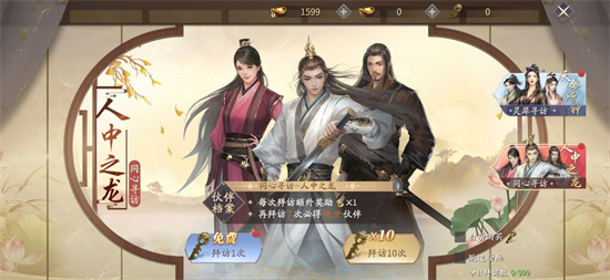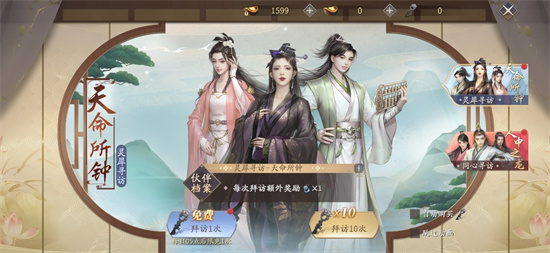 伙伴寻访分为“天命所钟”(每次消耗灵犀之钥×1)和“人中之龙”(每次消耗同心之钥×1)两种。