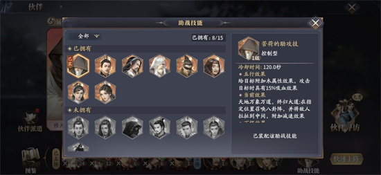 可通过伙伴助战入口进入伙伴助战技能界面选择助战技能。助战技能分为伤害型、控制型和辅助型三种,效果各不相同。