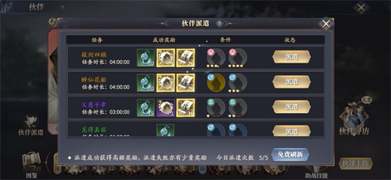 ④ 伙伴派遣需满足两个条件要求:第一个条件关乎伙伴品质或星级,第二个条件为伙伴身份或性别。
