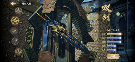 2、其中共有剑、双剑、双刃、琴和棍五种武器(棍为男性角色专属武器,琴为女性角色专属武器),每种武器代表不同的门派和五行,各自的优势也不尽相同。