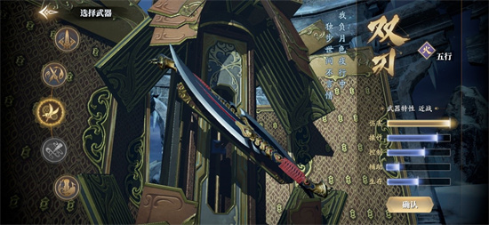 监察院六处专职暗杀的刺客们经常使用的双刃。武器优点是伤害极高,但是同样对玩家有着很高的操作要求,是追求高伤害、高操作的玩家首选。