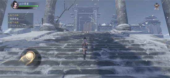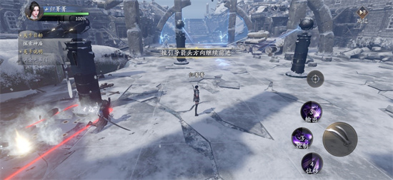 在选择完武器后,将前往神庙进行探索,在此将进行简单的操作教学和技能释放指引。左边区域控制角色完成移动,右边按钮控制释放技能。
