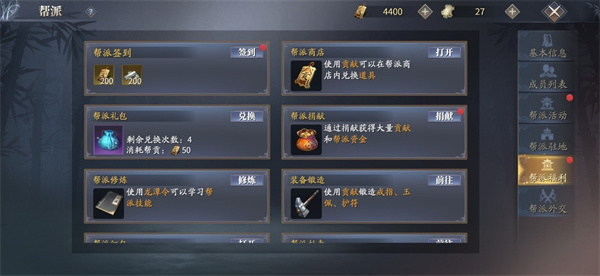 20级开启帮派功能,帮派成员参加各种帮派类活动,系统将根据参与人数或活动排名计算威望,帮派威望越高则帮派排名越靠前。