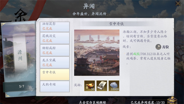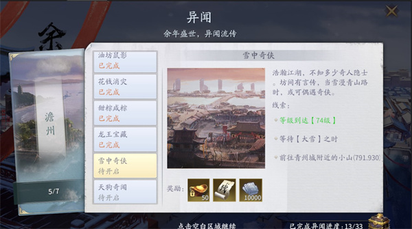 每个异闻可获取1万经验,别人比你等级高,可能差距就在这里。异闻触发条件各不同,有些需要主线剧情或等级、有些需特殊条件触发,如大雪天等。
